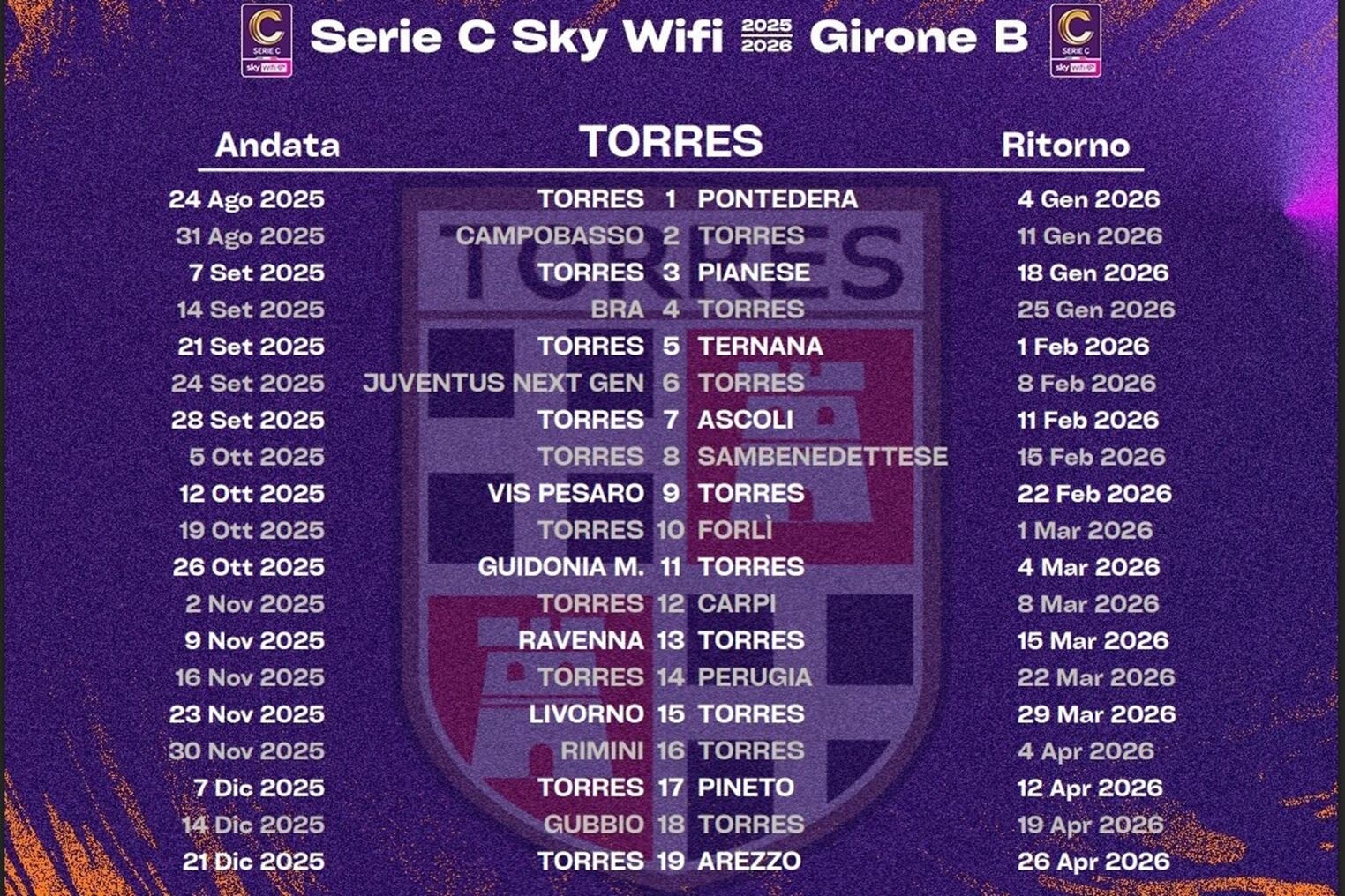 È stato pubblicato, sui canali social della Serie C, il calendario completo della stagione 2025-26. Per la Torres di Michele Pazienza esordio al Vanni Sanna contro il Pontedera.