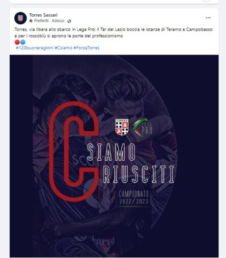 15.30 –ย Arrivano gli auguri e i complimenti per la Torres anche dal direttore generale dell’Arzachena, Antonello Zucchi: โCi tengo a fare i complimenti e gli auguri alla Torres, che torna finalmente nella categoria che spetta alla piazza sassarese, a differenza della Serie D. ร il giusto premio per la proprietร , e tutto il gruppo dirigente che un anno fa ha saputo gestire in maniera impeccabile una situazione non semplice, rilevando la societร vicinissimi allโinizio del campionato. Ora sarร chiamata a un altro grande lavoro, finendo di costruire la squadra in poco tempo. So cosa significa, รจ capitato anche allโArzachena in passato ma sono certo che sapranno fare tutto al meglio. Faccio un grosso in bocca al lupo a tutto il gruppo rossoblรน e spero tanto di poterli raggiungere al termine della prossima stagione in Lega Pro”.ย