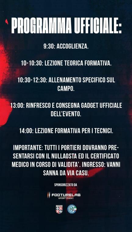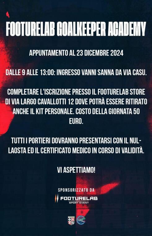 Come iscriversi? Per poter partecipare alla giornata in programma il 23 dicembre servirà completare l’iscrizione presso il FootureLab store situato al centro di Sassari, più precisamente in Largo Cavallotti 12, con i partecipanti che potranno ritirare il kit personale. Il costo per la giornata è di 50 euro con tutti i portieri che dovranno presentarsi all’evento con il nullaosta e il certificato medico in corso di validità .