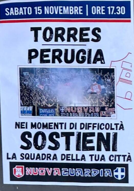 In occasione di un match così delicato e importante, la tifoseria organizzata rossoblù ha sparso e distribuito per tutta la città delle locandine con lo slogan: “Nei momenti di difficoltà , sostieni la tua città ”. Un messaggio semplice, chiaro e diretto, che mira a sensibilizzare quante più persone possibili nel venire allo stadio per dare sostegno a Mastinu e compagni, considerato il periodo di crisi che si sta vivendo e l’importanza cruciale del match di sabato. Infatti il Perugia, al momento, occupa la casella numero 18 a quota 8 punti, uno in più della Torres. Un bottino frutto di 1 vittoria, arrivata 3 giornate fa di fronte al proprio pubblico con il Livorno per 2-0, 5 pareggi e 7 sconfitte.