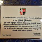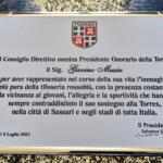 “Un passo obbligato nei confronti di Guido Garrucciu e Gavino Musiu, sebbene per motivazioni che abbracciano mondi diversi”, scrive la società nella nota di presentazione dell’iniziativa. Entrambi sono stati omaggiati dal patron rossoblù Salvatore Sechi con una targa che riporta la data di conferimento della Presidenza Onoraria. Per Garrucciu la cerimonia si è svolta negli uffici dello stadio alla presenza delle istituzioni comunali. La targa è stata consegnata dall’assessore allo sport del Comune di Sassari, Rosanna Arru, accompagnata dal dirigente Roberto Campus. Per Gavino Musiu, assente per un problema di salute, la cerimonia ufficiale è stata solo rimandata. Queste le motivazioni per il conferimento del titolo a Guido Garrucciu, per tutti la memoria storica della Torres: “Per il suo impegno di cultore della storia della Torres, la sua passione di tifoso, la vicinanza costante nel corso degli anni all’istituzione sportiva e la capacità unica di trasmettere, con scritti e ricordi indelebili, l’amore verso i colori rossoblù”. A Gavino Musiu: “Per aver rappresentato l’immagine più pura della tifoseria rossoblù, con la presenza costante, la vicinanza ai giovani, l’allegria e la sportività che hanno sempre contraddistinto il suo sostegno alla Torres, a Sassari e negli stadi di tutta Italia”.