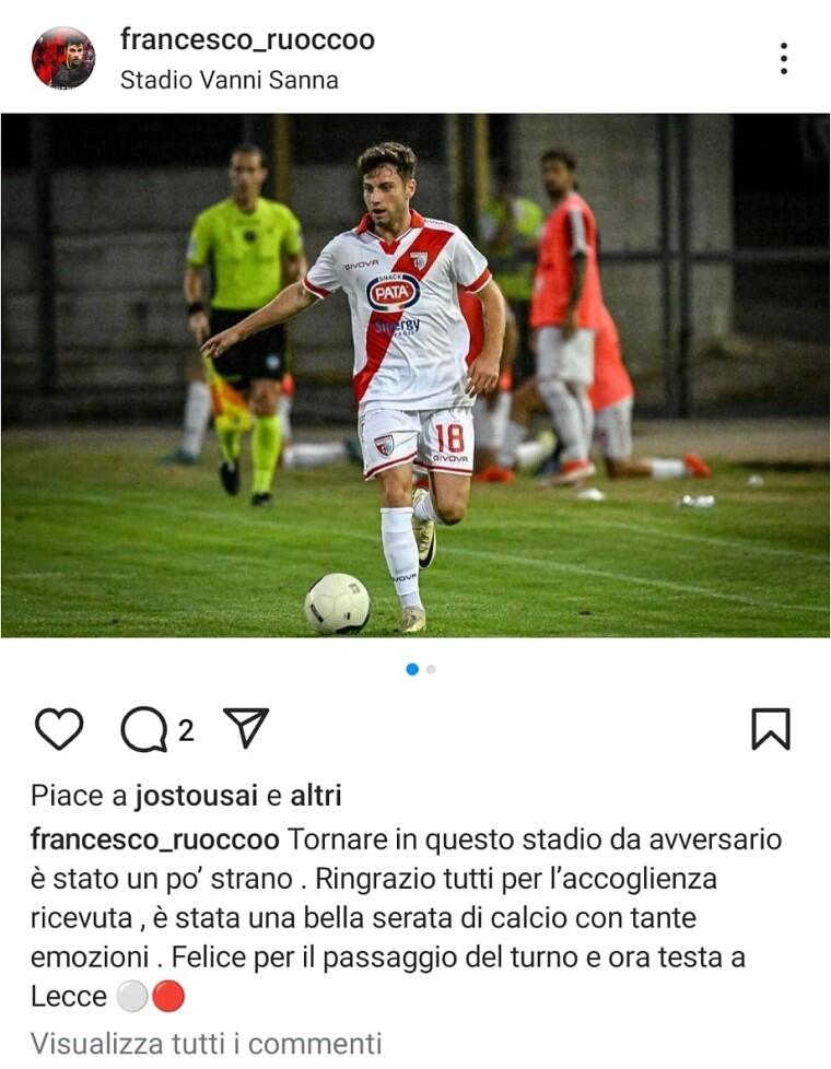 Dal saluto caloroso del pubblico del Vanni Sanna durante il riscaldamento pre-partita all’ingresso in campo nella ripresa fino al gol da ex sfiorato. Un mix di emozioni importanti quelle vissute da Ruocco, elogiato senza troppi indugi anche dal suo nuovo tecnico Davide Possanzini nella conferenza stampa post partita. E proprio della sua prima serata da ex in quel di Sassari ha parlato lo stesso Ruocco sul suo profilo Instagram. “Tornare in questo avversario da avversario è stato un po’ strano. Ringrazio tutti per l’accoglienza ricevuta, è stata una bella serata di calcio con tante emozioni. Felice per il passaggio del turno e ora testa a Lecce”, ha scritto l’attaccante del Mantova.