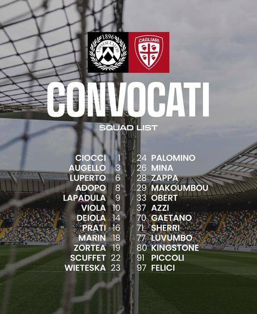 Sono 24 i convocati scelti dall’allenatore del Cagliari, Davide Nicola, in vista della sfida di domani, venerdì 25 ottobre, al Bluenergy Stadium contro l’Udinese, che aprirà la nona giornata della Serie A 2024-2025.