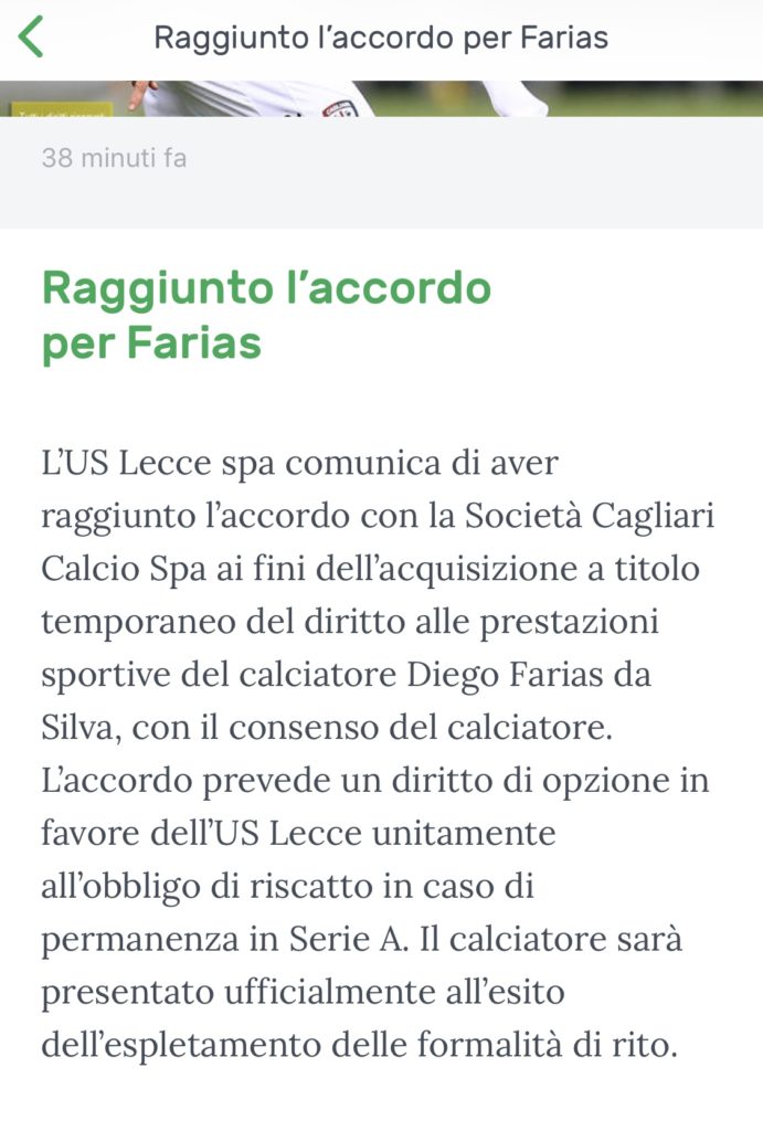 Questo il comunicato del club salentino: “L’US Lecce spa comunica di aver raggiunto l’accordo con la Società Cagliari Calcio Spa ai fini dell’acquisizione a titolo temporaneo del diritto alle prestazioni sportive del calciatore Diego Farias da Silva, con il consenso del calciatore. L’accordo prevede un diritto di opzione in favore dell’US Lecce unitamente all’obbligo di riscatto in caso di permanenza in Serie A. Il calciatore sarà presentato ufficialmente all’esito dell’espletamento delle formalità di rito”.