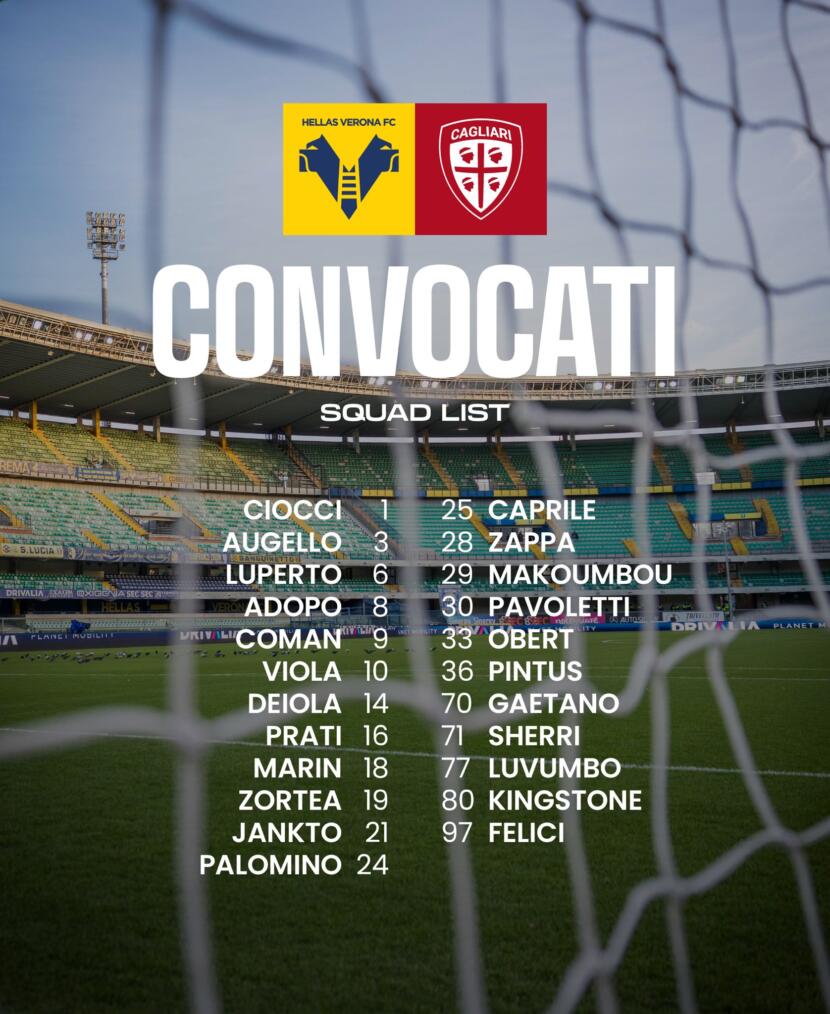 Sono ventitrรฉ i convocati di Davide Nicola per la partita del Cagliari contro l’Hellas Verona valida per il 34ยฐ turno di Serie A.