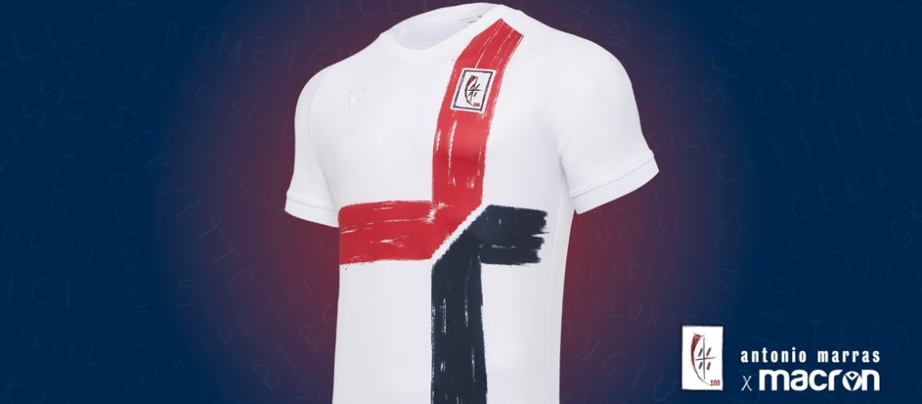 IL DISEGNO DI MARRAS – La divisa si presenta di colore bianco e caratterizzata da due grandi bande spennellate, entrambe per metà rosse e metà blu si incrociano senza toccarsi a metà altezza sul lato sinistro. Senza sindacare sui gusti personali di chi legge, è una maglia fortemente moderna e tutt’altro che celebrativa della propria storia, ma anzi sembra quasi proiettare la società nel futuro. Abbastanza stucchevole appare la scelta di nascondere sponsor (tutti sardi, tra parte anteriore, posteriore e maniche) e fornitore per dare un tocco vintage a una maglia che, però, vintage non lo è assolutamente. Del resto il Cagliari non pone alcun riferimento strettamente storico neanche nella descrizione, ma anzi spinge tantissimo sulla paternità del design: quell’Antonio Marras, stilista di Alghero, affermatosi con le sue realizzazioni in tutto il mondo. Una scelta altrettanto moderna e innovativa, in quanto raramente i grandi designer dell’alta moda si sono bonariamente “abbassati” alla creazione di collezioni teamwear sportive, limitandosi in genere alle divise di rappresentanza.