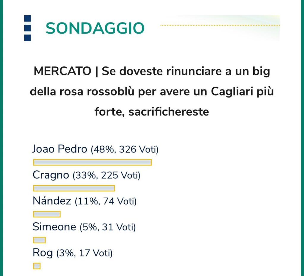 Sul nostro sito abbiamo chiesto ai lettori a quale giocatore della rosa avrebbero rinunciato piĂą volentieri per finanziare la campagna acquisti 2020-21. Con un totale di quasi 700 voti il 50% di voi ha scelto Joao Pedro. Il brasiliano, nonostante una stagione da record condita da 18 gol nell’ultima Serie A, per i tifosi del Cagliari che leggono le nostre pagine è il giocatore meno imprescindibile tra i top player della rosa rossoblĂą. Al secondo posto con il 33% dei voti c’è Alessio Cragno. Per poco meno di 230 sostenitori della squadra del presidente Tommaso Giulini il numero uno toscano è una delle pedine piĂą facilmente sostituibili o comunque non incedibili nelle logiche di mercato. Solo 73 voti per una eventuale cessione di Nandez e 31 per Simone. C’è un giocatore invece che quasi tutti vorrebbero vedere a Cagliari anche l’anno prossimo: Marko Rog. Solo 16 voti per un addio indolore del croato. L’ex Napoli con una stagione di equilibrio, corsa e qualitĂ sembra aver messo tutti d’accordo. Ma il Cagliari seguirĂ i pareri dei propri tifosi?