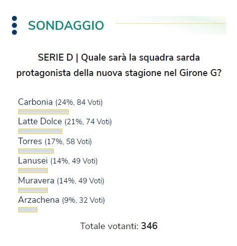Girone G della Serie D al via e tifosi e addetti ai lavori tirano le somme dopo aver visto i colpi di mercato e le prime uscite in amichevole delle sei sarde impegnate nel campionato: abbiamo chiesto ai nostri lettori quale delle squadre isolane, Arzachena, Carbonia, Lanusei, Latte Dolce, Muravera e Torres, potrebbe essere la protagonista del campionato.