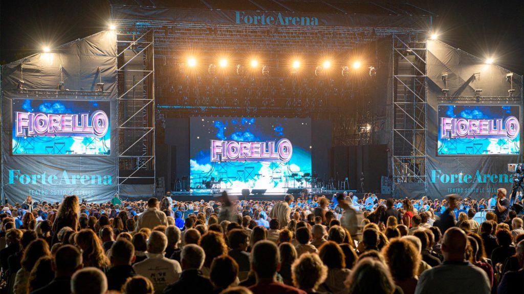 Fiorello inizia lo show, senza nemmeno iniziarlo, in quanto con grosso ritardo dovuto alla statale 195 bloccata, non ha voluto cominciare l’esibizione per permettere agli spettatori in coda di partecipare. Nel frattempo, ha intrattenuto il pubblico già presente fingendosi speaker, e improvvisando un perfetto accento cagliaritano. Esilarante. Solo questo varrebbe il prezzo del biglietto. Nel frattempo, in poltronissima, i fan non hanno dato tregua agli ospiti vip presenti. Michelle Hunziker, bella come una Barbie vera, Paola Cortellesi, dolce e gentile come appare nei film, e Amadeus, anticipato dallo stesso Fiorello come prossimo conduttore di Sanremo e Antonio Cassano. Dopo quasi un’ora di ritardo, ha finalmente inizio lo spettacolo. La splendida location, un cielo stellato ed un leggero venticello a mitigare l’altissima umidità , e l’intrattenimento hanno tranquillizzato l’impaziente quanto gremita arena.