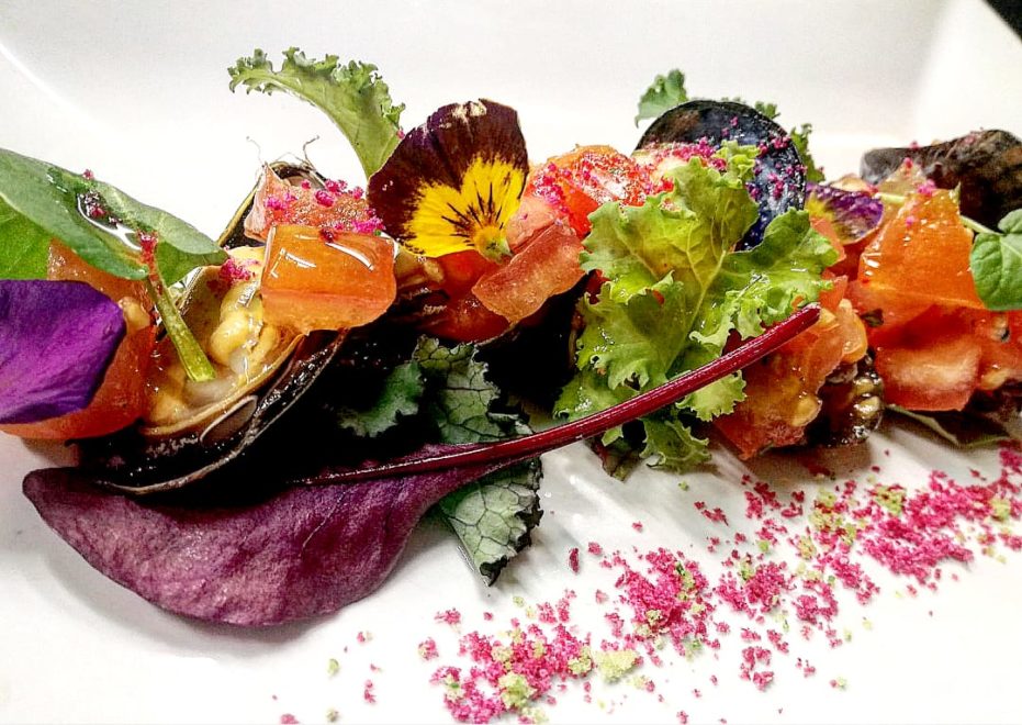 Posizionare le cozze in un piatto da portata, ricoprire ogni singola valva con il composto di verdure e aromi.