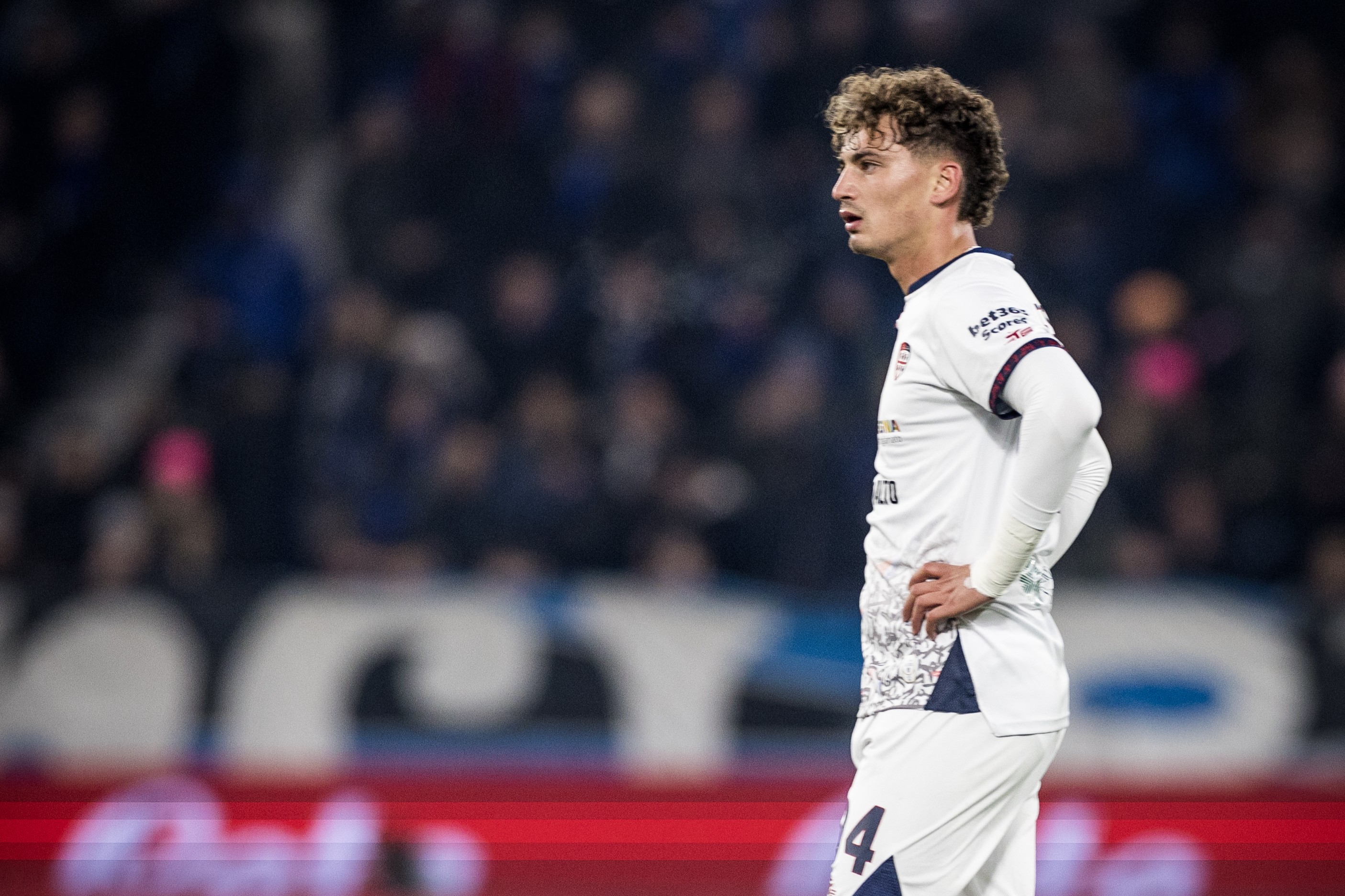 Baraye in mezzo non riesce a impattare pulito a causa della marcatura avversaria, spazza lontano la difesa rossoblù