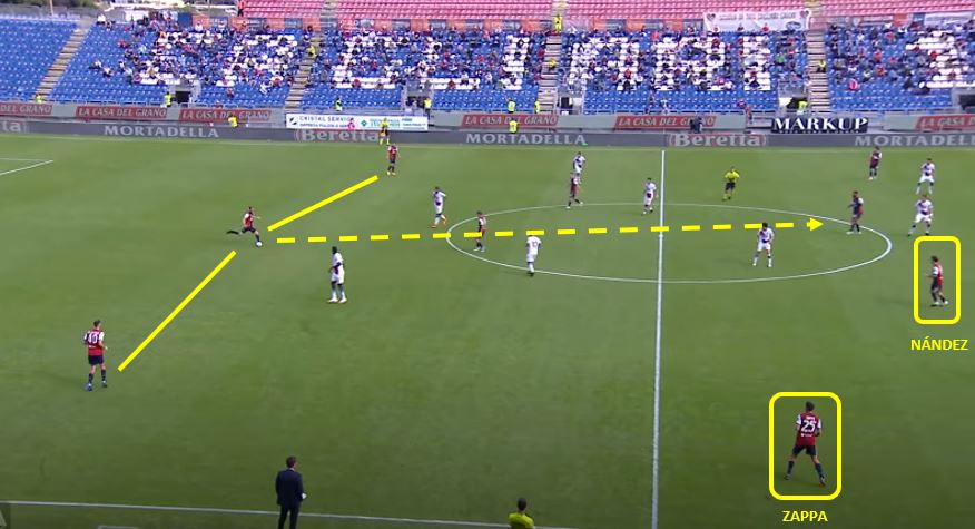 L’asse di destra – Il gol di Simeone richiama una soluzione che è ormai stata assimilata perfettamente dagli interpreti. La catena di destra composta da Zappa e Nández è la nota più positiva del Cagliari da Bergamo in poi. Il León che si accentra liberando la fascia per le scorribande del giovane terzino ex Pescara, la squadra che si schiera in fase di possesso con una sorta di 3-2-4-1 grazie alla duttilità di Lykogiannis, fondamentale per garantire equilibrio nel suo doppio ruolo di terzino e terzo di difesa, e all’affiatamento in costante crescita tra Nández e Zappa, senza dimenticare sul lato opposto la capacità di eseguire la doppia fase di Riccardo Sottil.
