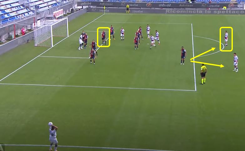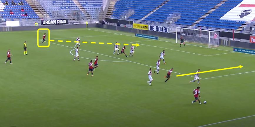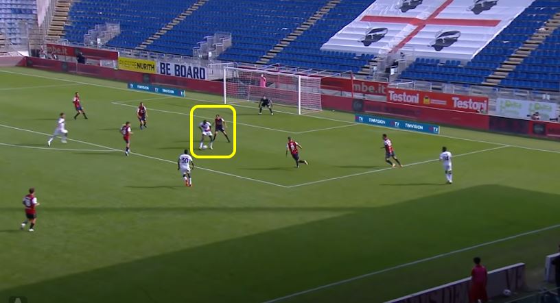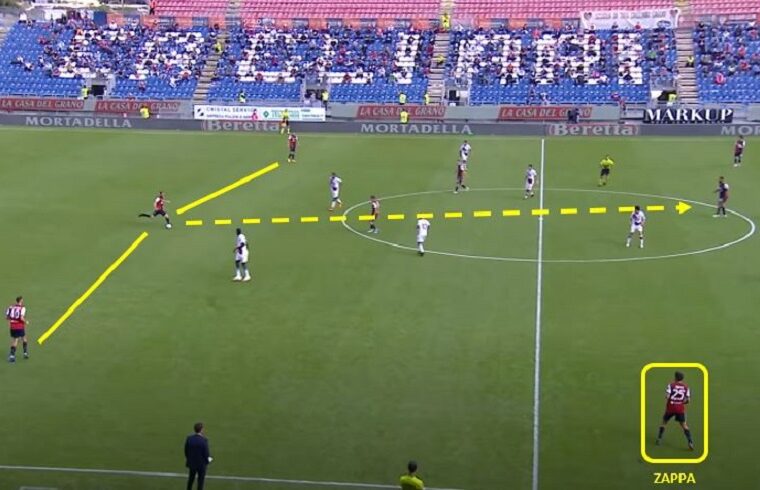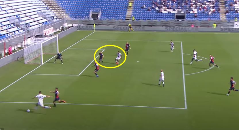 Il gol del definitivo vantaggio del Cagliari mostra un altro movimento della catena di destra. Non solo Nández che si accentra e Zappa che attacca lo spazio sull’esterno, ma anche il contrario. L’uruguaiano in occasione della rete di Sottil è l’uomo largo della coppia, mentre il terzino parte da una posizione più centrale per andare nello spazio verticale tagliando dall’interno verso l’esterno. Il resto è opera di Sottil, bravo a prendere il tempo all’avversario con una chiusura da quinto di centrocampo alla Gasperini che inizia la corsa largo per terminarla a centro area.