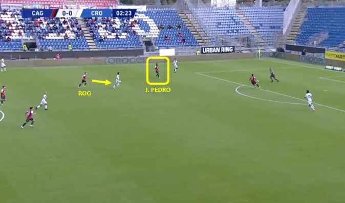 Joao Pedro l’uomo designato alla marcatura di Cigarini, ma quando il brasiliano accorciava su uno dei centrali ecco che Rog – o Marin – salivano per chiudere sul playmaker del Crotone. Solo in pochissime occasioni il professore è stato in grado di gestire la manovra, mentre molto più spesso i calabresi si sono affidati o ai centrali di difesa o soprattutto al libero aggiunto Cordaz. Si spiega così anche la gestione del pressing da parte di Simeone, spesso concentrato più sulla pressione al portiere che su quella dei difensori. Una partita preparata sul controllo di chi è in grado di aprire l’azione, lasciando totale libertà a quei giocatori del Crotone non dotati di abbastanza tecnica per far saltare il pressing rossoblù.