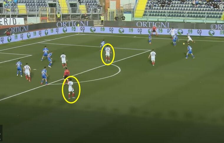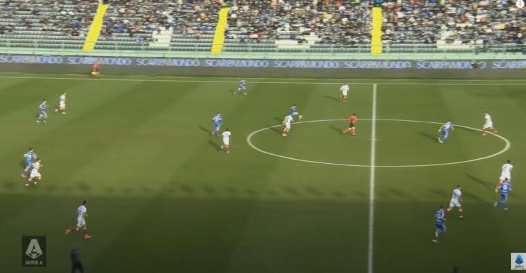 Il gol è anche una logica conseguenza dell’uscita dal campo di Lovato. Goldaniga tiene la linea troppo distante dalla zona di sviluppo dell’azione, costringendo la difesa a indietreggiare per aiutare il rientro dei compagni rimasti in avanti. Giusta la scelta iniziale, meno quella di non uscire mai e portare l’Empoli fin dentro la propria area. Da notare sia la posizione di Dalbert, ottimo inizialmente in ripiegamento, e quella di Obert, che sembra in controllo di Pinamonti.