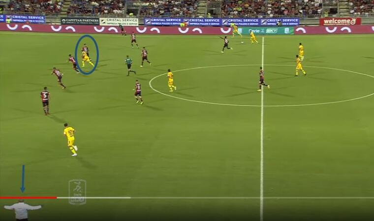 Dopo aver sofferto a lungo, il gol di Asencio è stata la logica conseguenza di una retroguardia apparsa ancora una volta in apnea. Frenesia nelle respinte, distanze, marcature. Quando poi la mediana ha lasciato giocare i centrocampisti avversari, ecco che i movimenti della difesa non sono stati la giusta reazione a quelli del Cittadella. L’azione che ha portato al vantaggio dei veneti nasce da un lancio di Vita, lasciato libero di pensare la verticalizzazione da un Makoumbou troppo leggero nella pressione. Con palla scoperta, però, tutta la linea arretrata esegue il movimento corretto scivolando all’indietro. Tutti tranne uno, Giorgio Altare, che resta con il corpo rivolto verso il pallone e perde di vista il diretto avversario. Solo quando la sfera termina tra i piedi di Asencio, il centrale ex Olbia – ormai tagliato fuori dal movimento della punta – prova a recuperare il terreno perduto. Da segnalare l’atteggiamento di Liverani (in basso nell’immagine) che fin dal momento in cui Vita sta per lanciare fiuta il pericolo e vede l’errore del suo difensore.