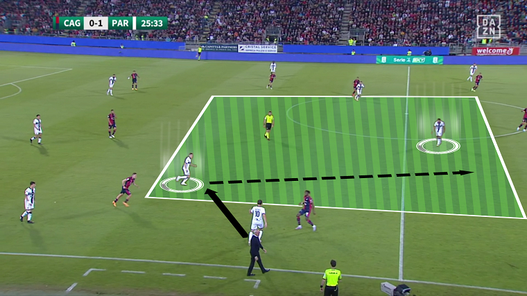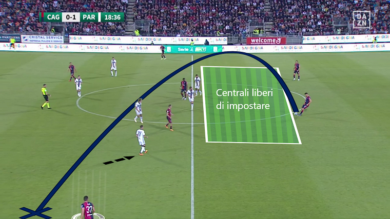 Dopo il gol dello 0-1 il Cagliari ha provato ad alzare la pressione. Pavoletti, infatti, non stava più a uomo su Bernabé ma usciva sul difensore centrale Osorio. Se il Parma stava dominando la partita in mezzo al campo prima, togliere Pavoletti dalla trequarti ha facilitato ulteriormente il lavoro ai ragazzi di Pecchia.