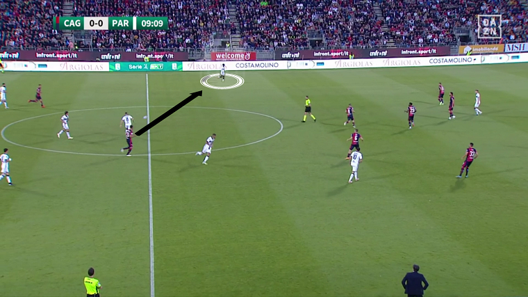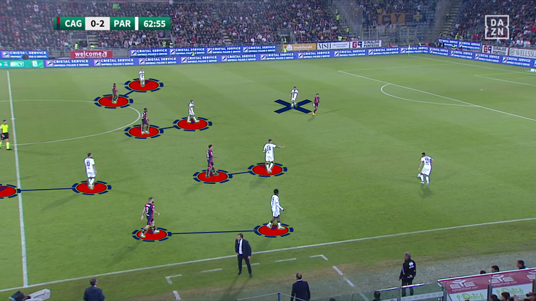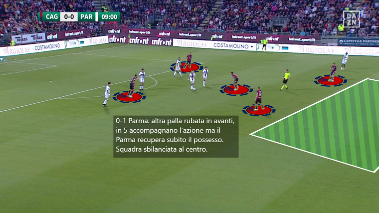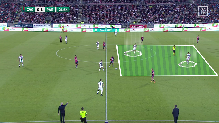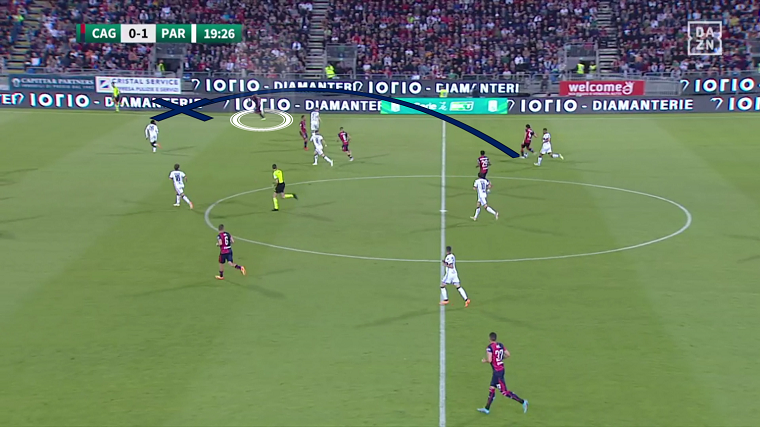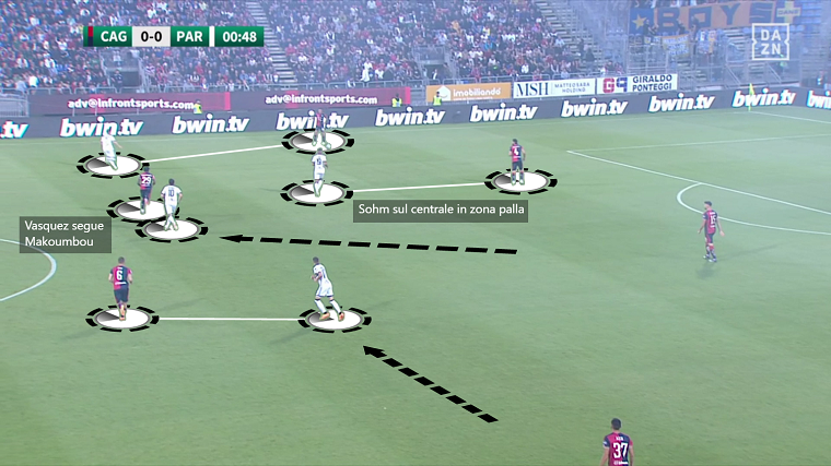 Il gol dello 0-2 nasce proprio da una pressione molto alta del centravanti toscano, accompagnato da Makoumbou alto sul mediano Estevez. Osorio serve Del Prato, Rog esce in ritardo. Vasquez si allarga ancora una volta alle spalle del croato, ma stavolta è bravo Azzi ad anticiparlo con i tempi giusti. Sfortunatamente però dopo il rimpallo il pallone torna tra i piedi del terzino del Parma, il quale può adesso servire il suo numero 10 totalmente libero. Il Cagliari è ancora una volta molto sbilanciato in mezzo al campo e i centrocampisti fanno parecchia fatica a rientrare. Estevez conduce per diversi metri, bel taglio centrale di Benedyczak che libera spazio sulla sinistra per Sohm che realizza il gol.