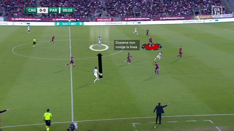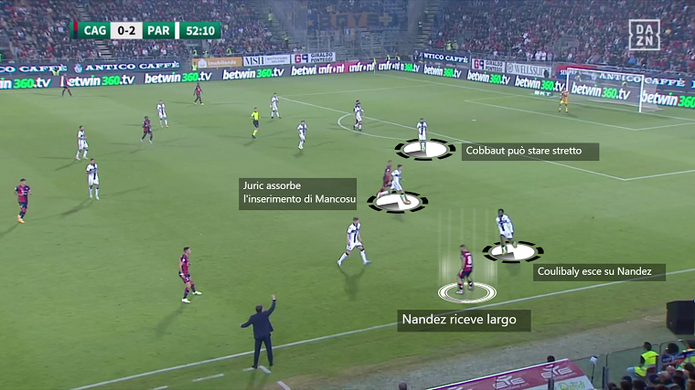 Andando per ordine, il primo gol nasce in questo modo: il Cagliari approfitta di un’indecisione in fase di costruzione del Parma per rubare palla e attaccare l’area con i due centravanti, Mancosu e le due mezzali. I Ducali però riescono a riconquistare immediatamente il pallone; la squadra di Ranieri è quindi estremamente sbilanciata. Vasquez si allarga sulla destra per ricevere in completa libertà il pallone, attirando l’uomo più vicino a lui, Makoumbou. Sohm allora dalla posizione di punta viene incontro alle spalle del congolese e riceve il pallone sfruttando la scelta di Dossena (e in generale dei due centrali rossoblù in ogni azione della partita) di non rompere la linea. I rossoblù collassano centralmente e i ducali trovano campo sulla sinistra con Coulibaly. Da quel momento in poi c’è ben poco da analizzare, lo scambio a tre che porta al gol di Benedyczak è semplicemente stupendo.