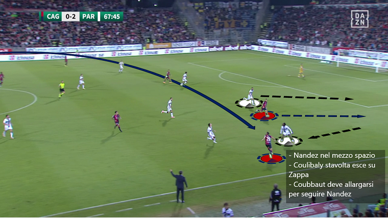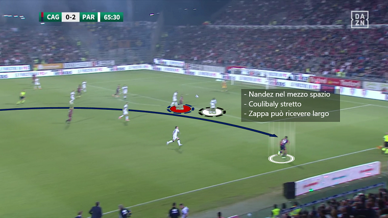 Proprio al 65’ c’è stata però un’azione particolare. Dossena come sempre libero di impostare tenta il pallone lungo verso Zappa, ancora una volta impreciso. In questo caso la scelta però era giusta: Nandez aveva stretto la sua posizione nel mezzo spazio destro al fianco di Lapadula (stessa cosa Luvumbo sulla sinistra) costringendo Coulibaly a rimanere molto stretto e lasciando libero Zappa in ampiezza.