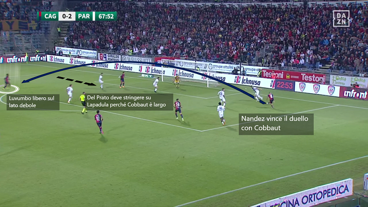 Due minuti dopo arriva il gol dell’1-2. La struttura offensiva del Cagliari è la stessa, stavolta Coulibaly però esce sul terzino rossoblù per paura che possa ricevere liberamente. Nandez allora lo attacca alle spalle costringendo il centrale Cobbaut ad allargarsi parecchio per seguirlo. L’uruguaiano sfrutta l’indecisione del difensore belga e vince il suo duello. Il terzino destro Del Prato è quindi costretto a stringere la sua posizione per mantenere il due contro uno su Lapadula in mezzo all’area, lasciando così Luvumbo libero sul lato debole. Solito bel cross di Nandez e tiro al volo perfetto dell’angolano con il piede meno delicato.