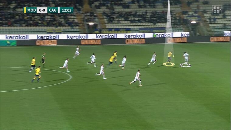 Spesso si ritiene che evitare la costruzione dal basso e giocare direttamente lungo sia una mossa più sicura che evita rischi inutili, ma in realtà non è sempre così. Capita non di rado che perdere un duello aereo e non vincere la seconda palla in seguito a un lancio lungo produca situazioni molto pericolose per gli avversari. Nelle due immagini sotto potete vedere un esempio di lancio lungo di Radunovic che nel giro di cinque secondi porta a un’azione pericolosa a favore del Modena. Saltare in questo modo il centrocampo avversario può essere un’ottima mossa se si dispone di un attaccante abile nel gioco aereo, ma farlo in assenza di un giocatore con tali caratteristiche produce soltanto palloni persi.