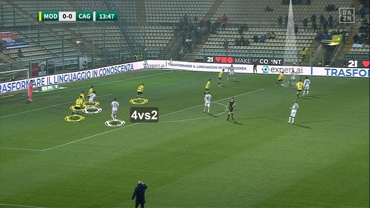Alla fine arriva la prima sconfitta per il Cagliari di Ranieri, caduto per 2-0 in casa del Modena dopo una partita in cui ha avuto più visibilità la pessima giornata dell’arbitro Perenzoni che le prestazioni delle due squadre. È difficile analizzare tatticamente una gara che vede una squadra in dieci uomini per l’intero secondo tempo, diventa quindi necessario focalizzarsi soprattutto sul primo tempo che ha visto ripetersi i soliti problemi dei rossoblù.