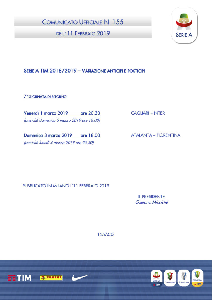 La Lega Serie A ha pubblicato le variazioni di anticipi e posticipi della settima giornata di ritorno.