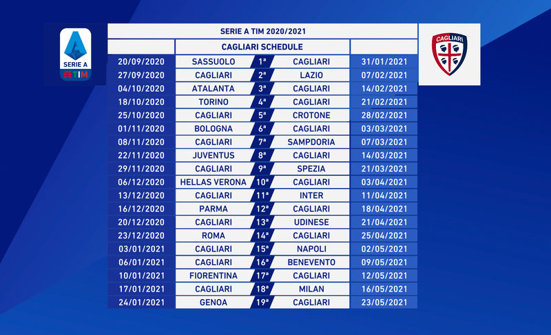 Il Cagliari di Eusebio Di Francesco inizierĂ il suo cammino da una sua ex squadra: si andrĂ infatti in trasferta a Reggio Emilia il 20 settembre contro il Sassuolo, successivamente subito una big con la Lazio che arriverĂ alla Sardegna Arena la settimana successiva. Il 4 ottobre viaggio a Bergamo al Gewiss Stadium contro l’Atalanta prima della pausa nazionali e poi sarĂ doppia trasferta col Torino del neo tecnico Marco Giampaolo il 18 ottobre. La settimana successiva si torna nell’isola per affrontare la neo-promossa Crotone, poi a Bologna e l’8 novembre contro la Sampdoria prima della nuova sosta. Si riprende il 22 novembre allo Juventus Stadium e poi si sfiderĂ un’altra bianconera, il neo promosso Spezia.