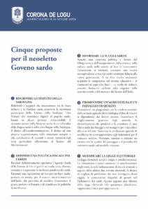 “La Corona de Logu, assemblea degli amministratori indipendentisti, prende atto delle dichiarazioni programmatiche di Christian Solinas, presidente della Regione Autonoma della Sardegna. Ad esse, la Corona de Logu risponde con cinque proposte, che presenta qui al neoeletto Governo sardo: cinque importanti sfide sulle quali misurare l’effettiva volontà della giunta Solinas di agire per il bene dei sardi e della Sardegna.