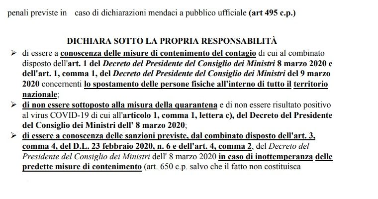 Rispetto alla precedente versione il nuovo scritto prevede un ulteriore punto che dichiara che colui che la compila di non essere sottoposto alla misura della quarantena e di non essere risultato positivo al virus COVID-19. Invariati i motivi consentiti per gli spostamenti, ovvero lavoro, salute, necessità e rientro presso il proprio domicilio o residenza. Vi saranno dei controlli lungo la viabilità principale e nelle stazioni ed aeroporti: la veridicità dell’autodichiarazione sarà stabilita con successivi controlli.