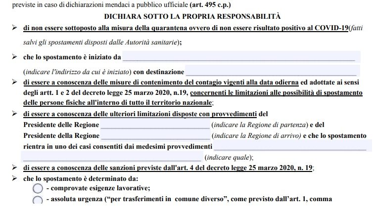 La principale novità risiede nella nuova sezione che stabilisce che il dichiarante conosce le nuove limitazioni imposte dal presidente della Regione di appartenenza e in quella in cui ci si dovrebbe spostare. Rimangono invariate le sezioni specificare i luoghi da cui parte e arriva lo spostamento da effettuare, dopo la restrizione del decreto di divieto di cambio comune a meno di comprovate esigenze, così come quelle riservate al dichiarante che assicura di non essere sottoposto alla misura della quarantena e di non essere risultato positivo al virus COVID-19 e i motivi consentiti per gli spostamenti, ovvero lavoro, salute, necessità e rientro presso il proprio domicilio o residenza. Vi saranno dei controlli lungo la viabilità principale e nelle stazioni ed aeroporti: la veridicità dell’autodichiarazione sarà stabilita con successivi controlli.