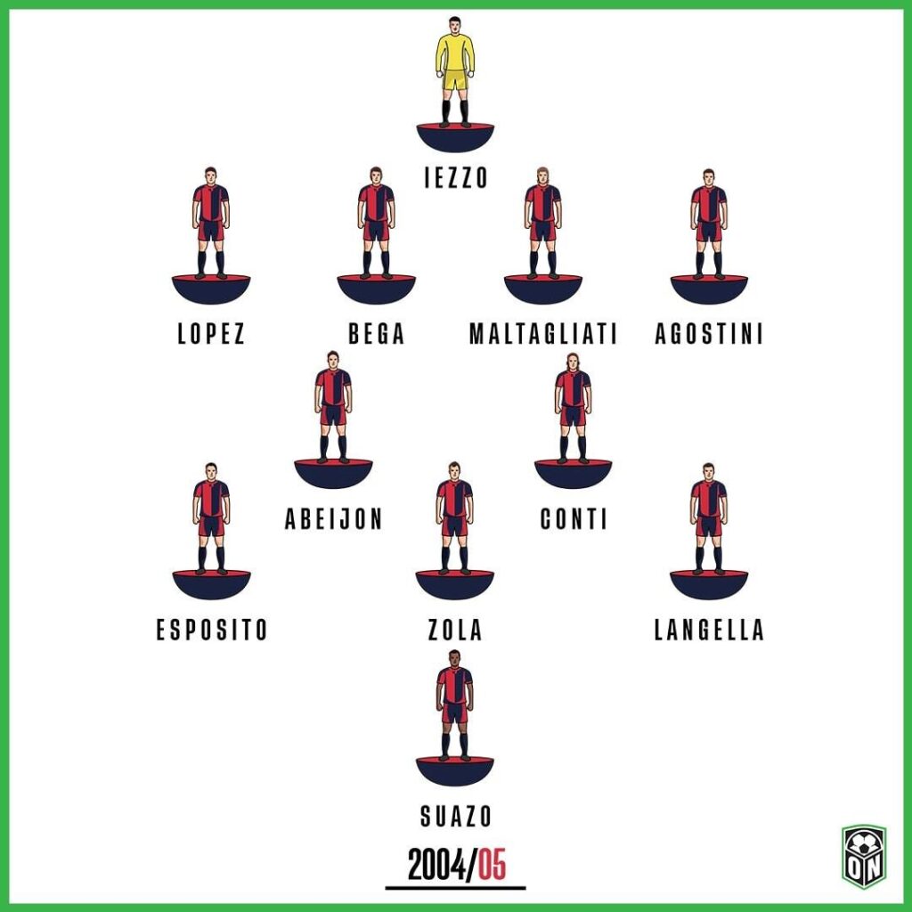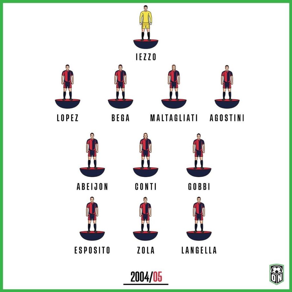 Due versioni, una con il classico 4-3-3 con il tridente formato da Zola, Esposito e Langella, insieme a un ultraoffensivo 4-2-3-1 con il trio alle spalle di David Suazo. È l’omaggio che Operazione Nostalgia, realtà editoriale nata per esaltare i decenni d’oro della Serie A italiana come i Novanta e primi Duemila, ha voluto tributare al Cagliari del 2004-05, quello con Daniele Arrigoni in panchina e che tante soddisfazioni seppe regalare ai tifosi rossoblù. “Abbiamo scelto proprio quel Cagliari – ci racconta Nando Di Giovanni, coordinatore editoriale di Serie A-Operazione Nostalgia – perché rappresenta la summa di tutti i valori che noi, abitanti del Continente, ascriviamo ai rossoblù. Ossia l’attaccamento alla maglia di Zola, il fatto di aver conquistato e difeso la Serie A con il duo di esterni formato da Mauro Esposito e ‘Arrogutottu’ Langella, due ragazzi senza pedigree che si fanno strada nel calcio italiano di quegli anni. O Suazo, la promessa sempre sul punto di esplodere che finalmente riesce a far vedere di essere un attaccante di valore anche in Serie A, così come Daniele Conti che riesce a togliersi di dosso l’etichetta di ‘figlio di Bruno’, trovando una propria consacrazione. Insomma, tutti elementi che certamente hanno suscitato tanta simpatia anche in chi non è tifoso del Cagliari”.
