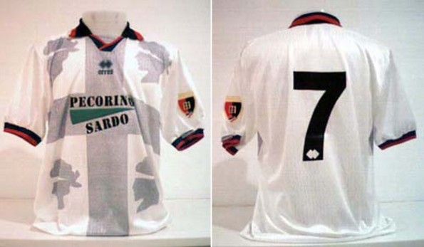 LA SARDITÀ CONTROVERSA – L’altra creazione di Marras, il logotipo per la celebrazione del centenario del Cagliari, è altro fattore di innovazione: semplice nella sua fattura, rimane moderno e inusuale per un simbolo sportivo. Esso, più originale di tanti altri – si veda quello della Lazio per i 120 anni, della Salernitana e del Parma nell’ultimo biennio, o nel passato della Juventus e così via per tanti altri loghi per il centenario – dà però l’impressione di essere più adatto a un poster o un francobollo e quindi a maggior ragione stona sulla maglia racchiuso nel rettangolo, quasi a mo’ di corpo estraneo sulla divisa. L’altro aspetto controverso nella sardità di Marras e della sua maglia è la presenza di una croce, presumibilmente facente riferimento alla bandiera sarda (ma non dichiarata esplicitamente), e con l’assenza delle teste di moro, annullando quindi perlomeno l’effetto di “maglia bandiera”. In effetti sarebbe potuto essere un richiamo velato alla maglia away 1995-96 (unica nella storia rossoblù con una croce), ma sarebbe stata troppo una maglia richiamante (involontariamente a questo punto) il passato.