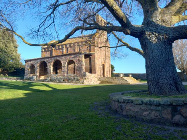 A questo punto ci siamo lasciati alle spalle la chiesa e siamo tornati per la strada percorsa allāandata per dirigerci verso il Monte Limbara, che si vede in lontananza. Dicono che questo monte rappresenta un confine naturale tra la Gallura e il Logudoro. Nella zona troviamo paesi e borghi molto belli come Tempio, Calangianus, Oschiri e Berchidda, quest’ultimo per il quale ho una predilezione per le sue meravigliose “panadas” che sonoĀ buonissime. La nostra prossima chiesa di destinazione si trova in una bellissima vallata che scorre attraverso il fiume Coghinas e dalla quale vedremo il lago omonimo. In questo territorio del comune di Oschiri troviamo anche un’incredibile quantitĆ di resti archeologici, dalla preistoria, attraverso la civiltĆ nuragica, romana e medievale. Se vorrete dunque potreste fermarvi anche per una sosta extra dal nostro percorso sul romanico sardo.Ā Quindi dopo altri 15 minuti di viaggio lungo la E840 troviamo l’imponente Santuario di “Nostra Signora di Castro” l’ingresso ĆØ gratuito, e sono aperti tutti i giorni dalle 08:00 alle 17:00 (nel caso si volesse chiamare per assicurarsi dellāapertura il numero ĆØ 079-733018, con +39 se chiamate da fuori Italia). Ebbene, come vi dicevo, ĆØ un gioiello Romanico che non può mancare nel nostro tour, ĆØ tutto molto ben curato e nel patio, appena entri, ci trovi un grande albero. Fu edificata alla fine del XII secolo con facciata in trachite rossa. La chiesa ĆØ piccola con un’unica navata centrale lunga 11 metri per 6 di larghezza, ma da cui, sulla destra, nasce il portico che fu aggiunto successivamente. Dall’esterno si possono vedere anche un’abside semicircolare e un tetto in legno con capriate.